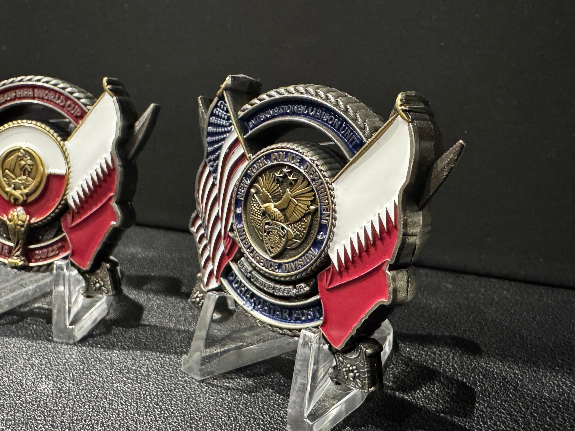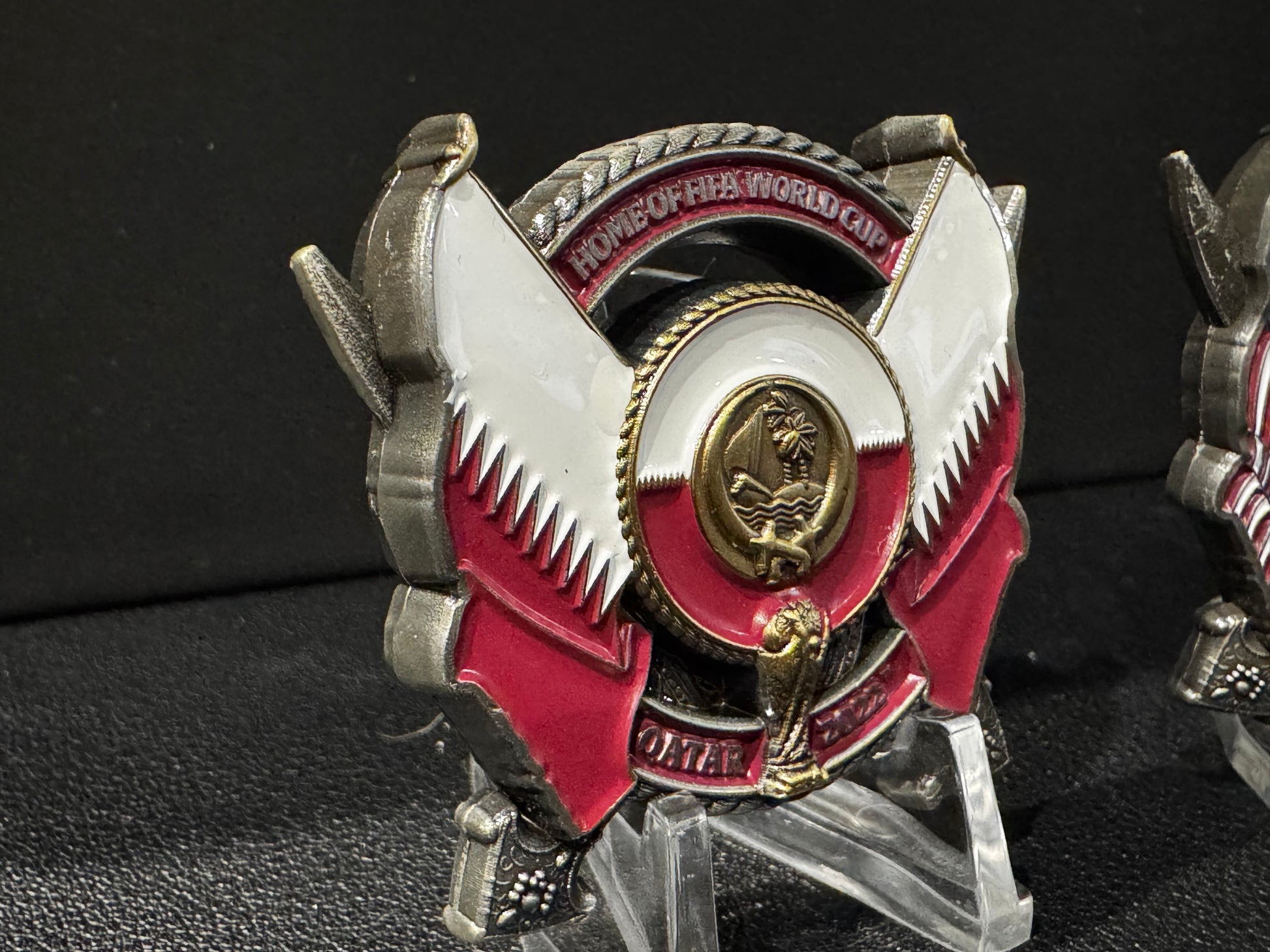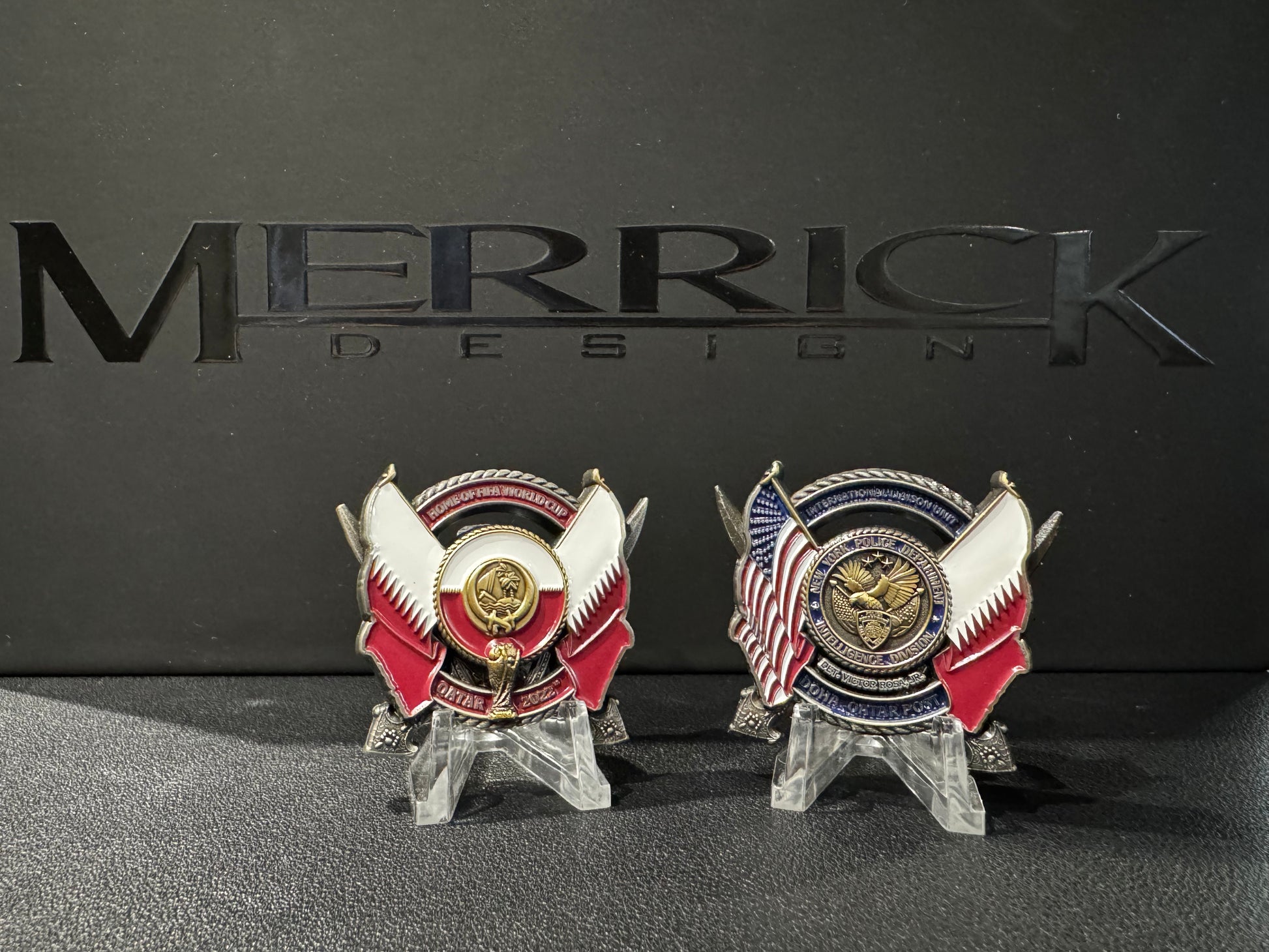 2" coin. 3-D both sides. Antique gold and antique silver plated. Enamel accents. These coins are in hand.