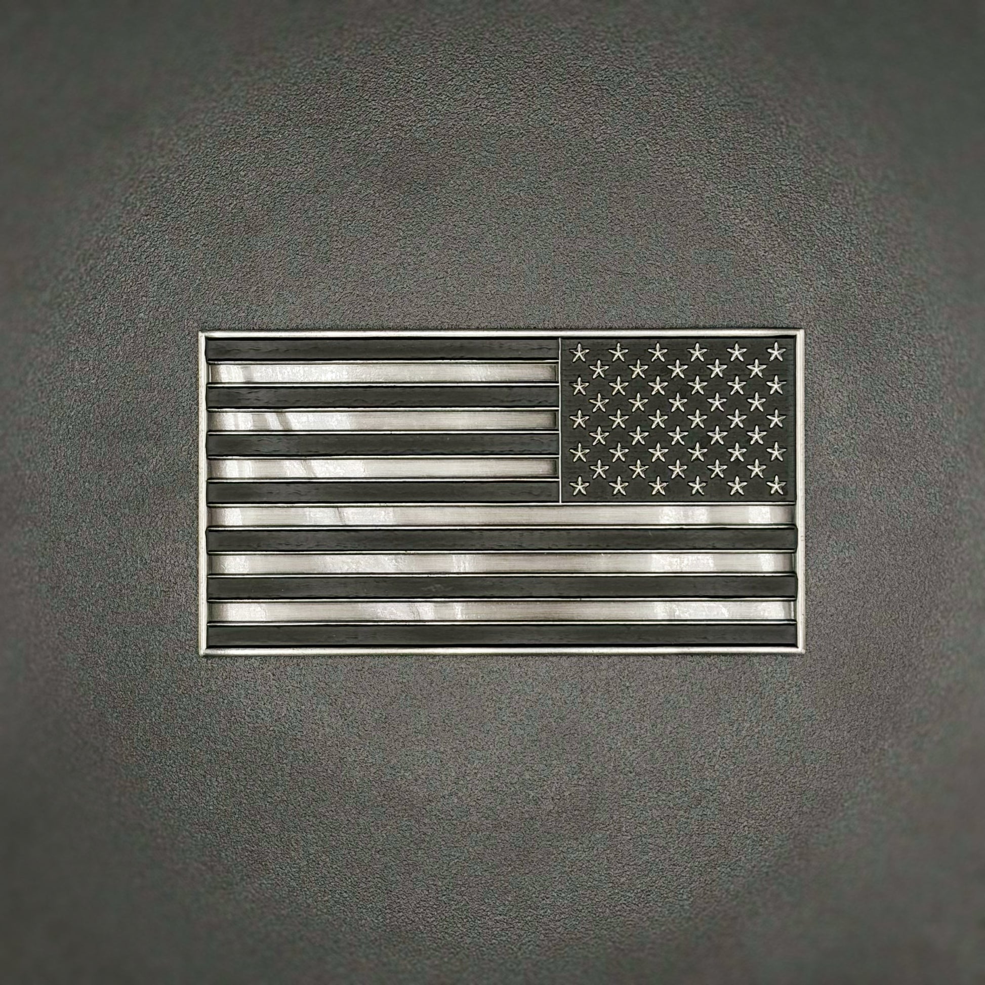 This 4 inch U.S. flag metal auto decal features a reverse orientation 3D textured design with an antique silver finish and matte black accents. Includes 3M automotive adhesive backing for secure mounting on vehicles or smooth surfaces.